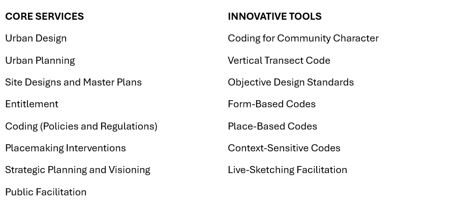 Offering urban design, planning, entitlement, coding reform, street design, facilitation, and placemaking expertise services for your development, neighborhood, or city. By blending timeless urban design techniques with innovative approaches to solve public or private client objectives, let’s work together to develop and implement a strategic plan that achieves, and exceeds, your goals.