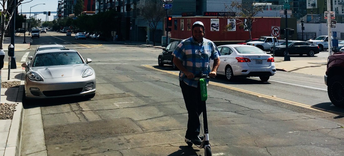 [This was first published in Voice of San Diego on April 24th. I’d like to add that the ability to scooter around with your work clothes on it an advantage to using these versus bicycles for short, work-oriented trips. The fun, convenience, and cost combination makes scooters a viable mobility tool to cut emissions and auto trip to meet our Climate Action goals.]